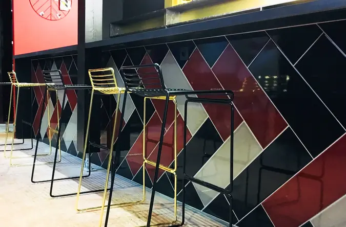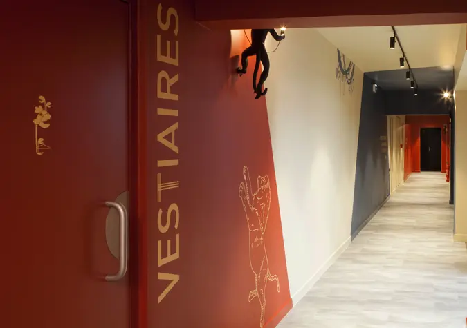 Nous avons créé et pensé le style et l'ambiance de cette salle : un espace restauration intérieur avec accueil, bar et une cuisine professionnelle. Cet espace sportif déploie un espace osthéo, de spacieux vestaires avec douches et sanitaires (PMR compris), un espace musculation, bureau et réserve, une véranda et un espace restaurant extérieur. Décoration, luminaires et lustre créé sur-mesure, mobilier sur-mesure et installation.
